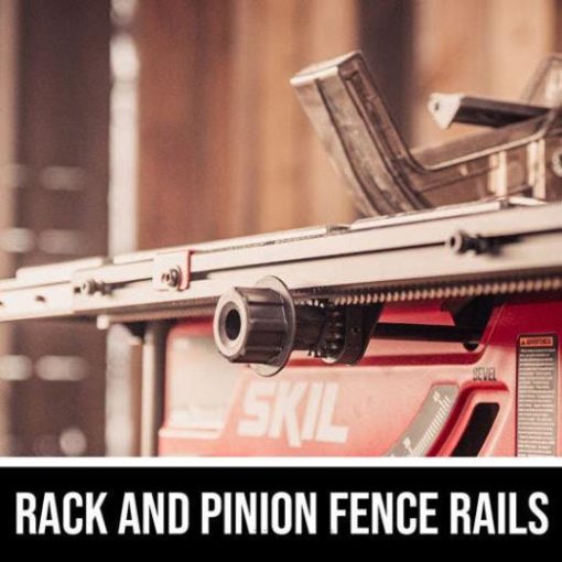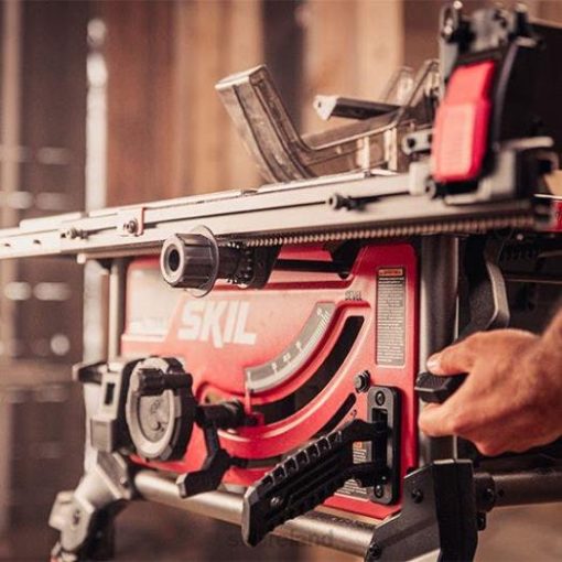The SKIL TS6307-00 10″ Jobsite Table Saw has a 25-1/2″ (64.77cm) Rip Capacity and is equipped with a 15-Amp motor, integrated foldable legs, rack & pinion fence rails, and a dust port elbow to keep your jobsite clean. The 15-Amp motor quickly rips through hardwoods with ease, while the rack & pinion fence rails make fence adjustments fast, smooth, and accurate. With its 0-45 bevel capacity, the quick release lever allows for cuts between two positive stops at 0 and 45 degrees, and its 4×4 cutting capacity allows for swift 90-degree cutting. The integrated foldable legs seamlessly form into a folding stand to provide portability and convenience, while the dust port elbow systematically redirects dust to a container for easy cleanup. The parallel blade alignment allows for ease of blade adjustment along the rip fence and miter slot, for precise accurate cuts. This table saw features a safety anti-restart switch in case of power outages.This large coated cast aluminum tabletop saw comes equipped with a 10″ 24-tooth carbide blade. When using a dado insert, this table saw requires an 8 in. dado blade set.
